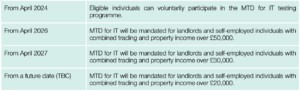 Prior to the Autumn Budget, there was hope that the new Labour Government might further delay the introduction of Making Tax Digital for Income Tax (MTD for IT). However, such hopes were dashed on Budget Day, with confirmation of the previously-announced timescales and an additional announcement that individuals with income from trading or property over £20,000 will be mandated to comply with MTD requirements in future. The mandate timescales are as follows: